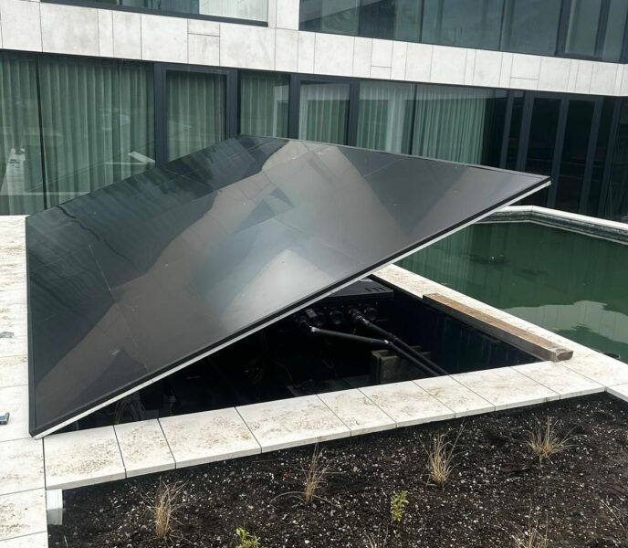 Deze enorme koivijver, met een inhoud van 75.000-80.000L, zweeft volledig boven een ondergrondse parking van twee etages. De vijver is ongetwijfeld het meest unieke project dat we al verwezenlijkt hebben.