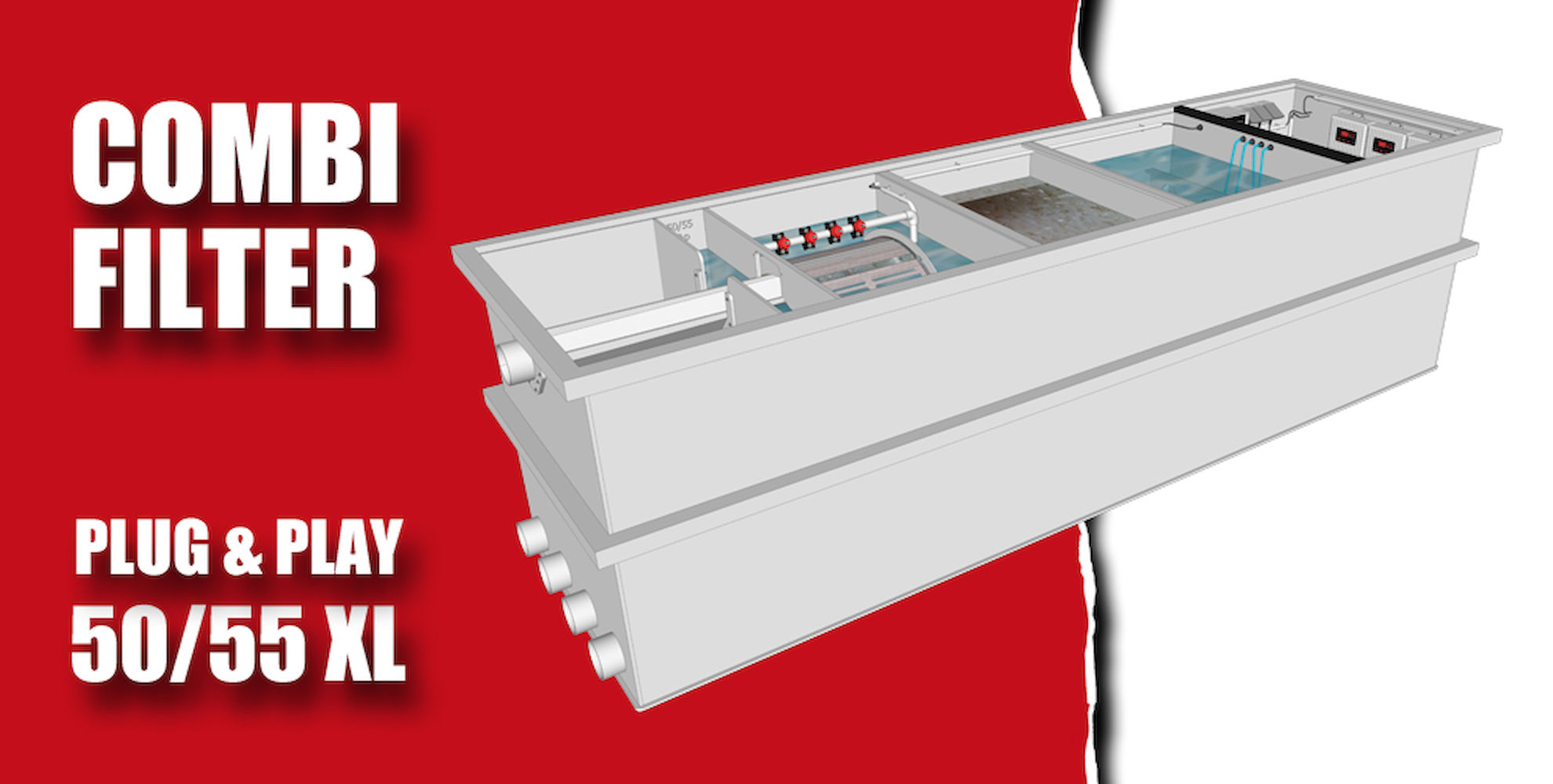 Bij voorkeur wordt de filter geplaatst in een toegankelijke filterruimte of filterput, waar traditioneel meerdere losse filterunits, leidingen en pompen samenkomen. Deze klassieke opstellingen nemen vaak veel ruimte in en vragen een complexe installatie. De Red Label Plug & Play systemen lossen dit probleem op door de volledige filterlijn samen te brengen in één compacte en overzichtelijke behuizing.