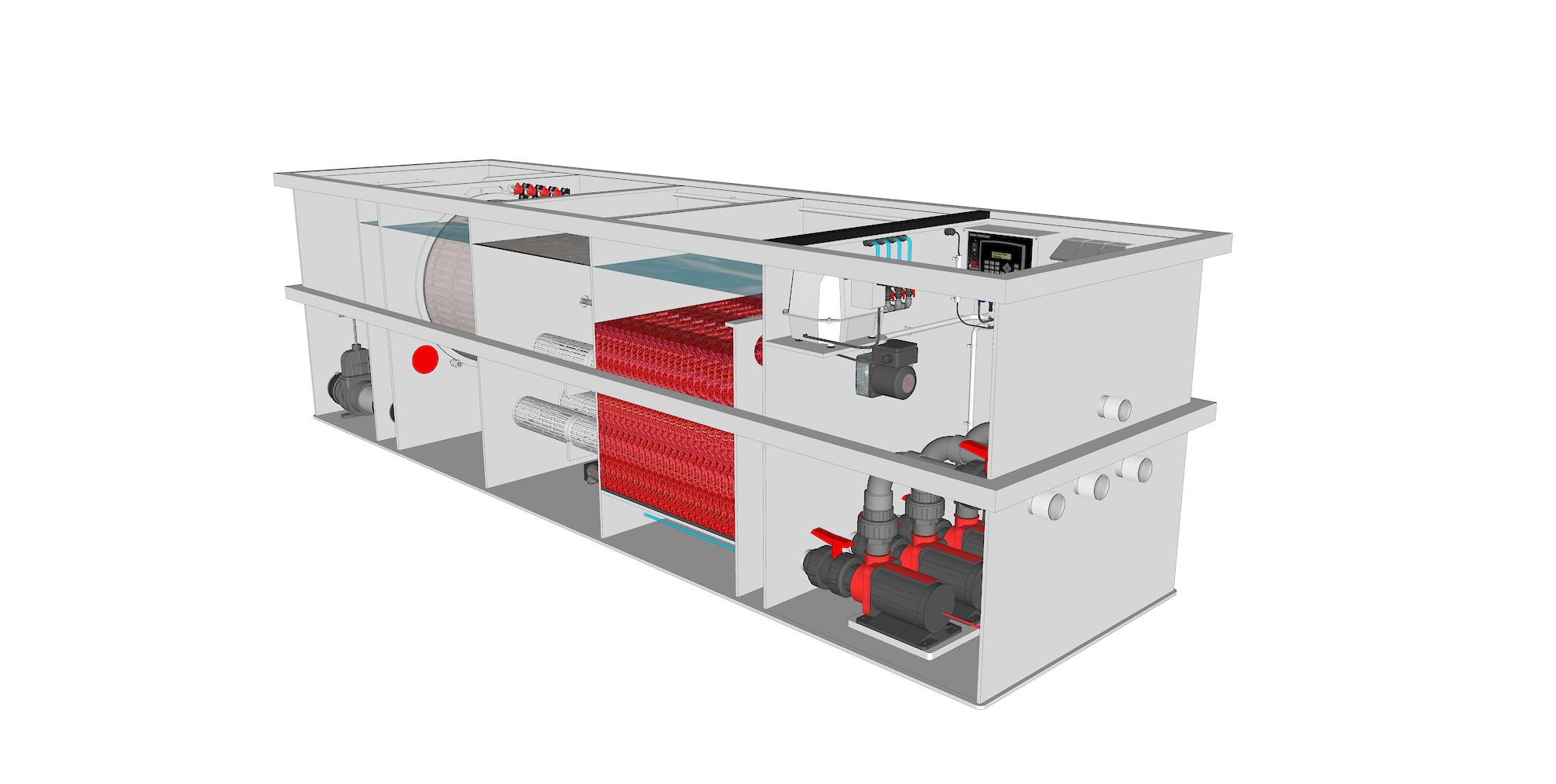 Alle essentiële componenten zijn geïntegreerd in de filterinstallatie. Het vijverwater komt binnen in een compacte ontvangstkamer met schuifafsluiters en stroomt vervolgens naar het drumfilter voor de mechanische filtratie. In de volgende kamer zorgt de moving bed filter voor de biologische afbraak van afvalstoffen. Vanuit de vierde filterruimte wordt het volledig gezuiverde water terug naar de vijver gepompt. Deze laatste ruimte bevat bovendien de volledige aansturing van het Plug & Play systeem en is uitgerust met een automatische dompelpomp die eventueel verzameld water veilig afvoert.