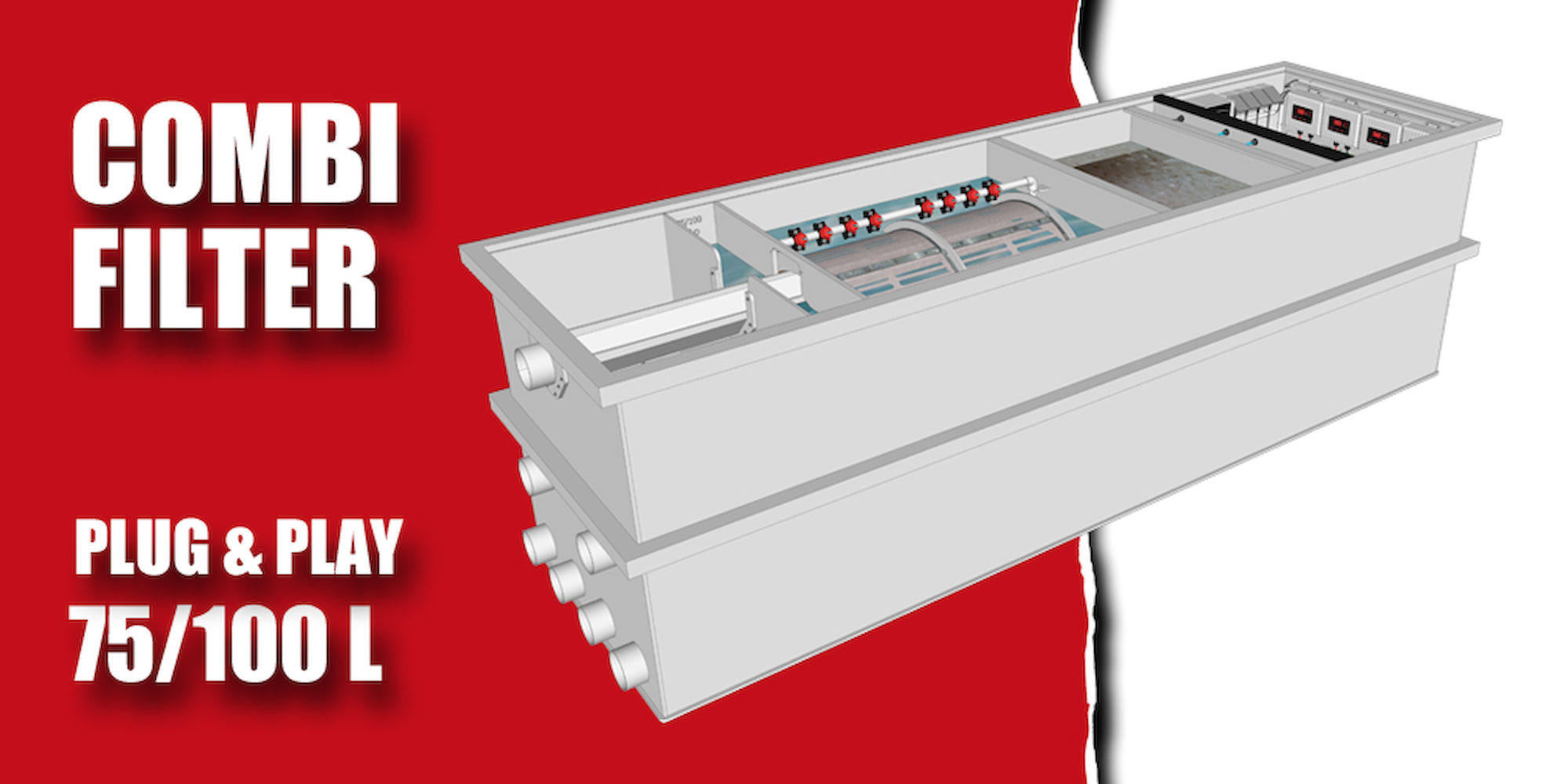 Bij voorkeur wordt de filter geplaatst in een toegankelijke filterruimte of filterput, waar traditioneel meerdere losse filterunits, leidingen en pompen samenkomen. Deze klassieke opstellingen nemen vaak veel ruimte in en vragen een complexe installatie. De Red Label Plug & Play systemen lossen dit probleem op door de volledige filterlijn samen te brengen in één compacte en overzichtelijke behuizing.