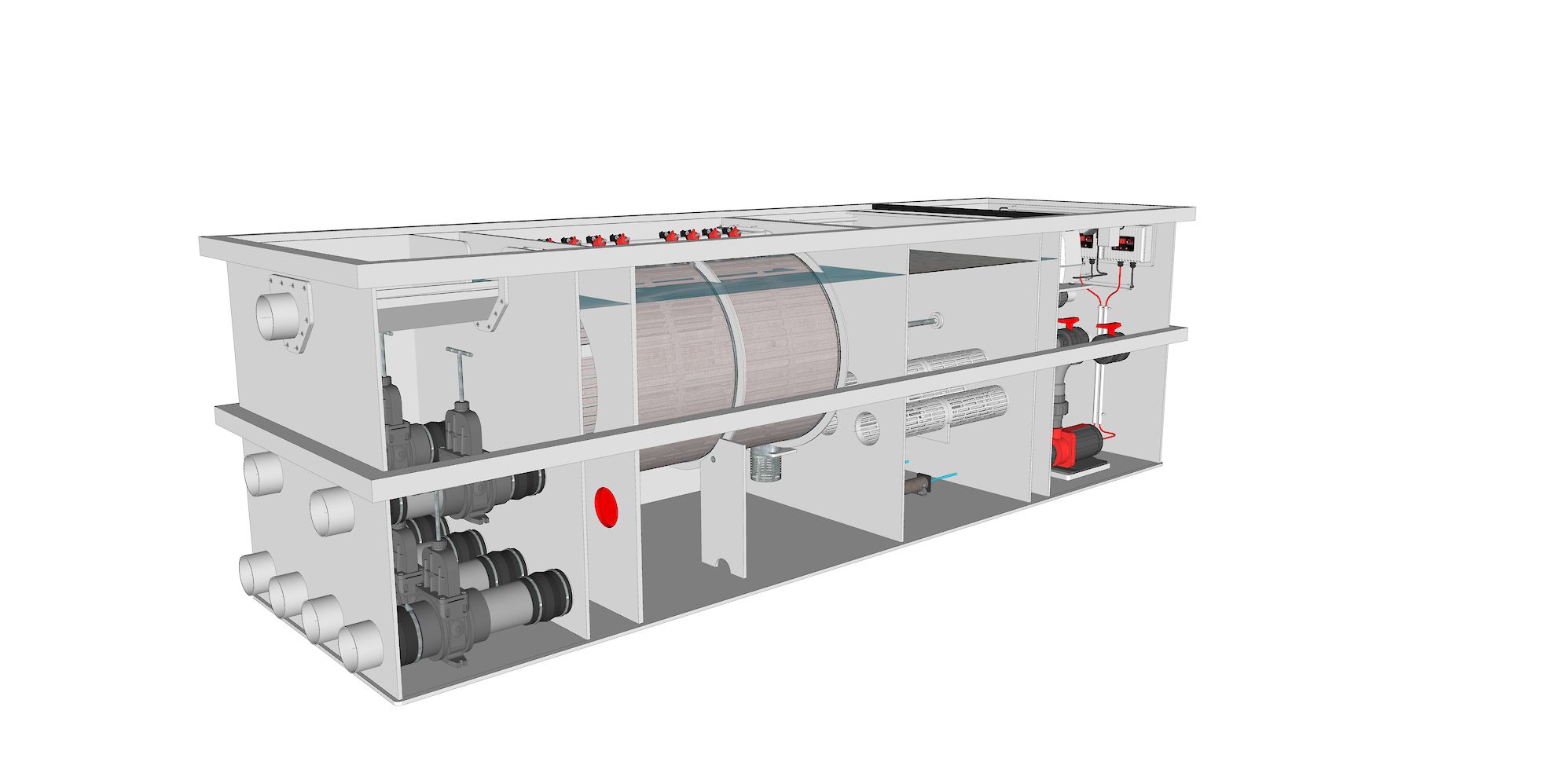 Alle essentiële componenten zijn geïntegreerd in de filterinstallatie. Het vijverwater komt binnen in een compacte ontvangstkamer met schuifafsluiters en stroomt vervolgens naar het drumfilter voor de mechanische filtratie. In de volgende kamer zorgt de moving bed filter voor de biologische afbraak van afvalstoffen. Vanuit de vierde filterruimte wordt het volledig gezuiverde water terug naar de vijver gepompt. Deze laatste ruimte bevat bovendien de volledige aansturing van het Plug & Play systeem en is uitgerust met een automatische dompelpomp die eventueel verzameld water veilig afvoert.