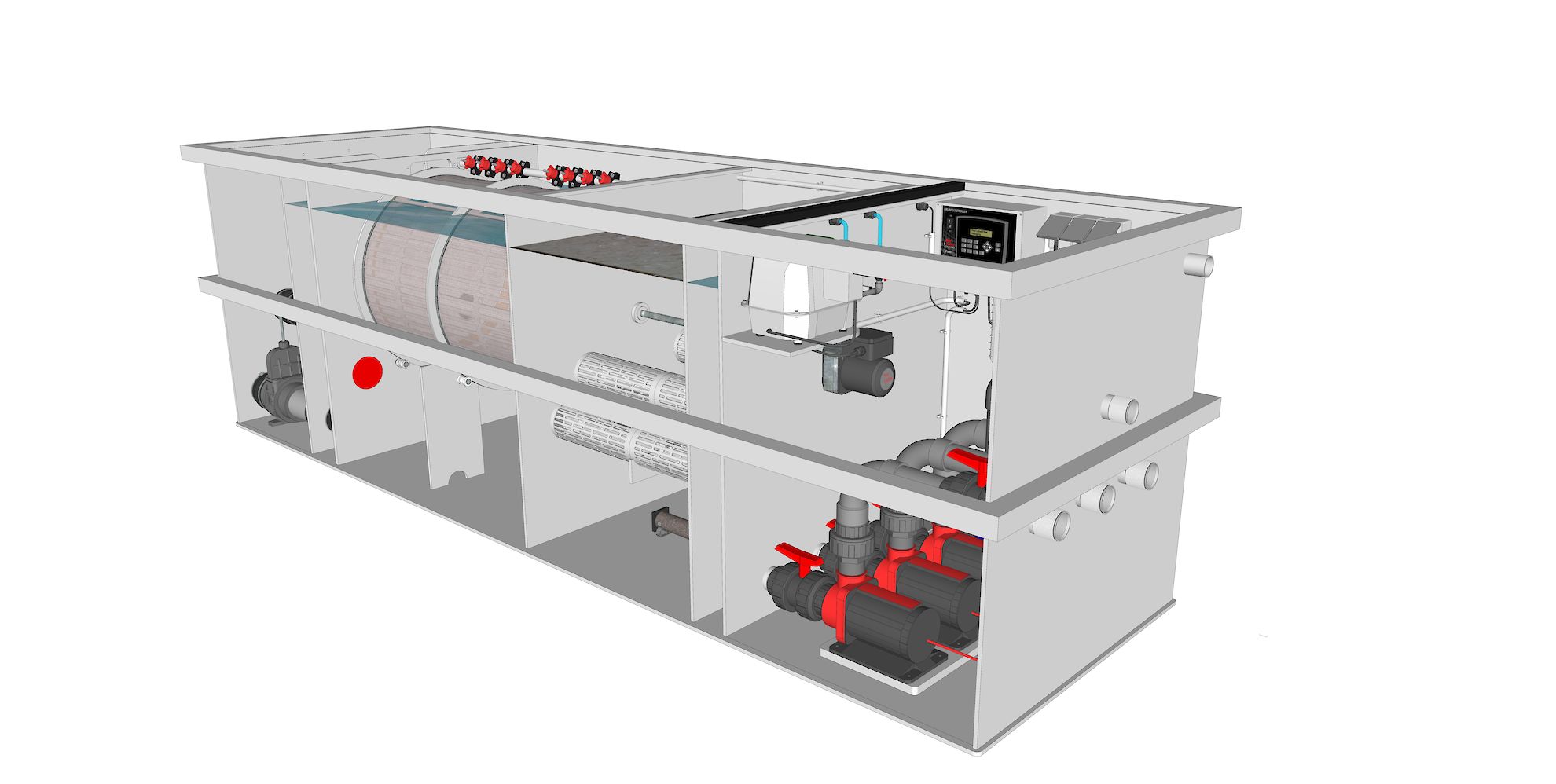 Alle essentiële componenten zijn geïntegreerd in de filterinstallatie. Het vijverwater komt binnen in een compacte ontvangstkamer met schuifafsluiters en stroomt vervolgens naar het drumfilter voor de mechanische filtratie. In de volgende kamer zorgt de moving bed filter voor de biologische afbraak van afvalstoffen. Vanuit de vierde filterruimte wordt het volledig gezuiverde water terug naar de vijver gepompt. Deze laatste ruimte bevat bovendien de volledige aansturing van het Plug & Play systeem en is uitgerust met een automatische dompelpomp die eventueel verzameld water veilig afvoert.