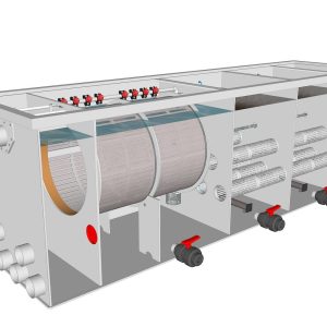 Het drumfilter fungeert als mechanisch voorfilter en verwijdert op een efficiënte en gebruiksvriendelijke manier zeer fijne vervuiling tot 70 micron uit de waterstroom. Hierdoor wordt het grove én fijne vuil al in een vroeg stadium afgevoerd, wat de belasting op de biologische filtering aanzienlijk verlaagt. De constructie uit hoogwaardige materialen zoals RVS en polypropyleen (PP) garandeert een lange levensduur en een betrouwbare werking.