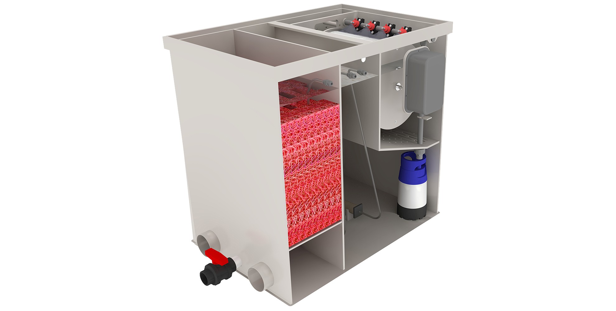 De filter beschikt over drie perfect afgestemde filterkamers: een krachtig drumfilter voor de mechanische filtering, een bewegend bedfilter voor een efficiënte biologische zuivering en een derde kamer die vrij kan worden ingericht naar wens, bijvoorbeeld met filtermatten. Dit maakt de HAPPY filter bijzonder flexibel en veelzijdig inzetbaar.